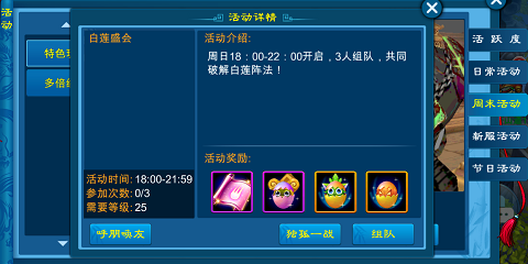 每周日18:00至22:00开放,三人组队破解白莲阵法,赢取极品仙宠、灵南仙果及天赋仙书四阶卷轴等珍稀奖励。