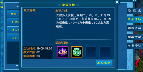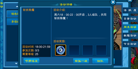 周六18:00至22:00开放,组队清除妖魔,赢取海量灵气,为打造极品装备奠定基础。