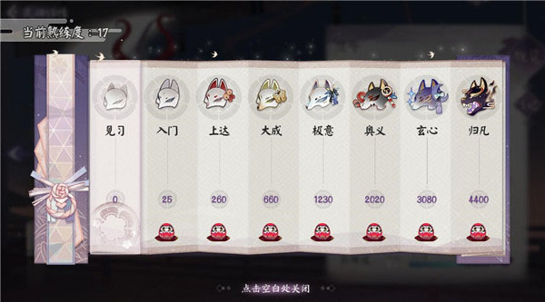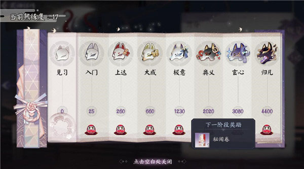 熟练度达到“入门”“上达”“大成”时,各奖励5000金币;升至“极意”“奥义”“玄心”时,分别获得100、120、140御札;抵达最高阶“归凡”则奖励一札秘闻卷。