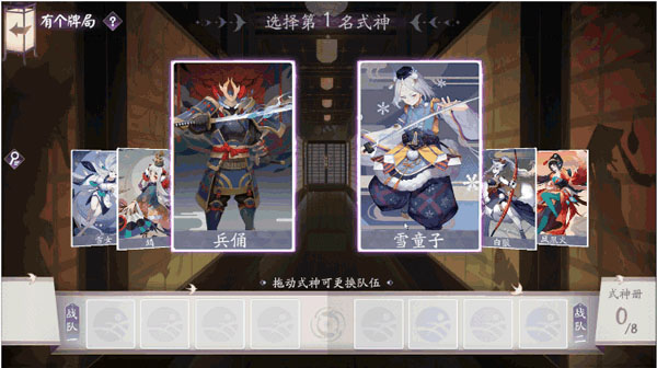 玩家将经历八轮式神选择,最终组成两支队伍参战。每轮从两个式神中挑选其一,被选式神后续关联的两名式神会成为下一轮的候选。选定后,系统自动生成由8张卡牌组成的该式神专属牌组。