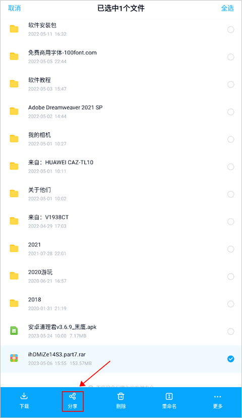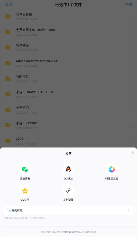 在文件列表中选中要分享的内容,页面会显示隐藏的操作选项,点击“分享”按钮进入分享设置界面。