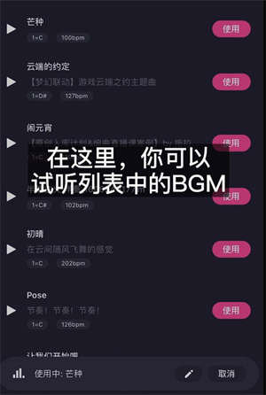 在此页面中可浏览并挑选喜爱的背景音乐,点击“使用”即可完成更换。