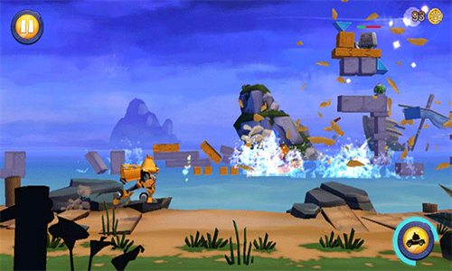 面对即将坍塌的高塔障碍,及时点击屏幕右下角的汽车图标,角色将瞬间变形为高速载具,迅速穿越危险区域,避免被掩埋。