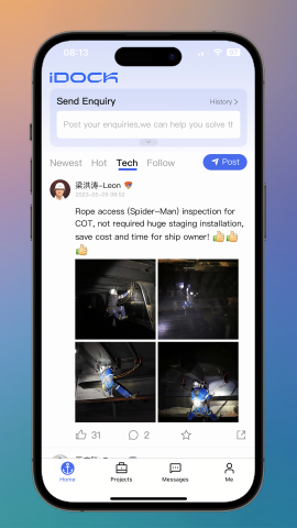 iDOCK是一款面向船舶行业的高效办公工具,用户可通过该应用便捷获取航运相关资讯,实时浏览同行分享的社区动态。平台还集成了船舶维修服务模块,所有在执行的任务均可在线详细呈现,确保工程进度、费用预估、检测流程及质量监管等环节全程留痕、清晰可查,有效提升作业透明度与管理效率。