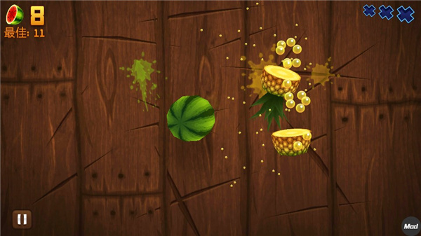 游戏核心玩法是通过手指滑动屏幕切开不断抛出的水果,避免误切炸弹。