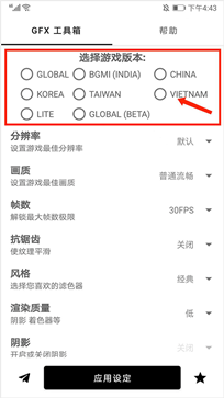 1. 打开gfx工具箱最新版本,进入主界面后首先选择对应的游戏服务器版本。目前支持国服、越南服、印度服、韩服、台服等共八个区域版本。以下以【越南服】为例进行演示: